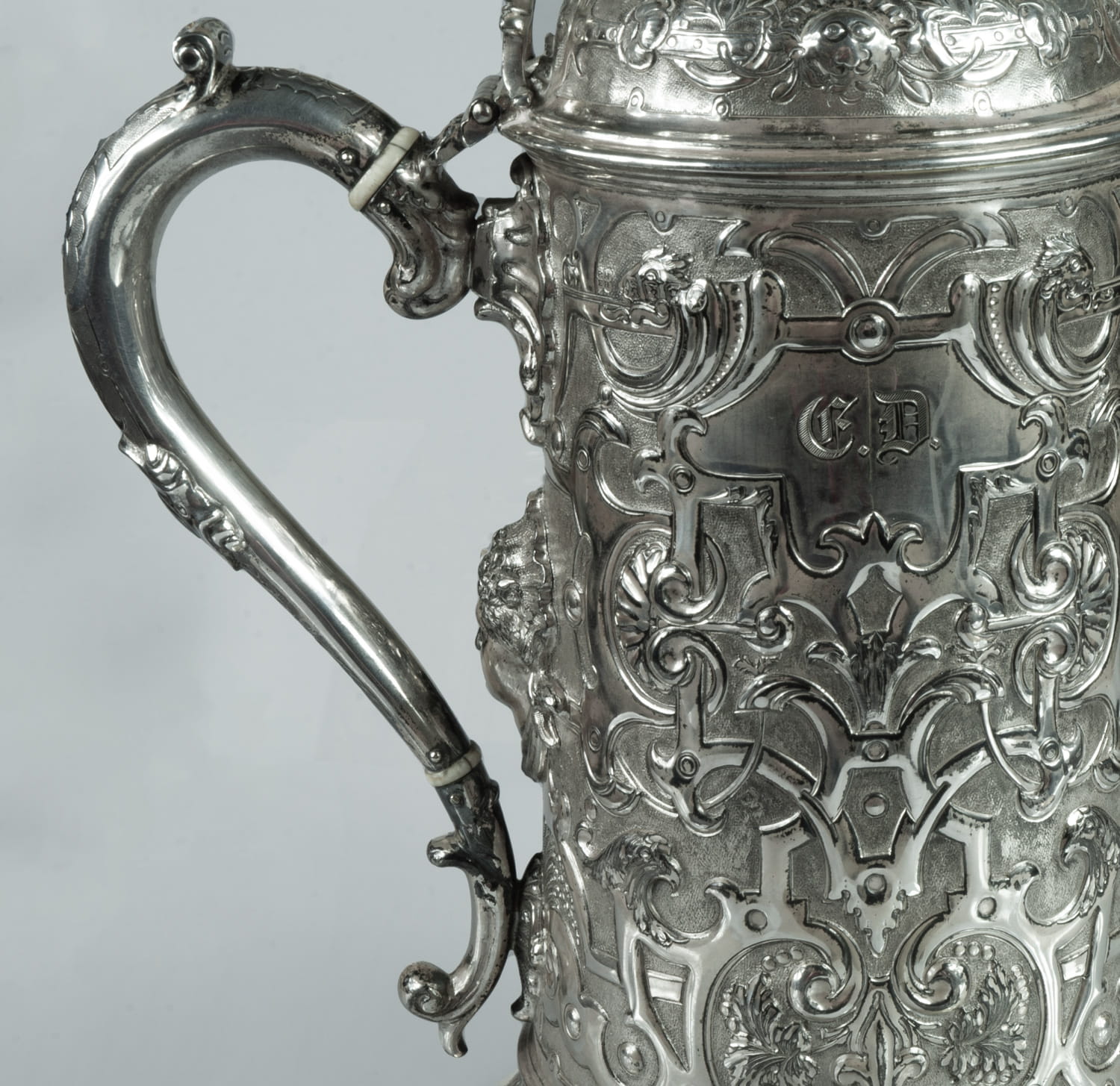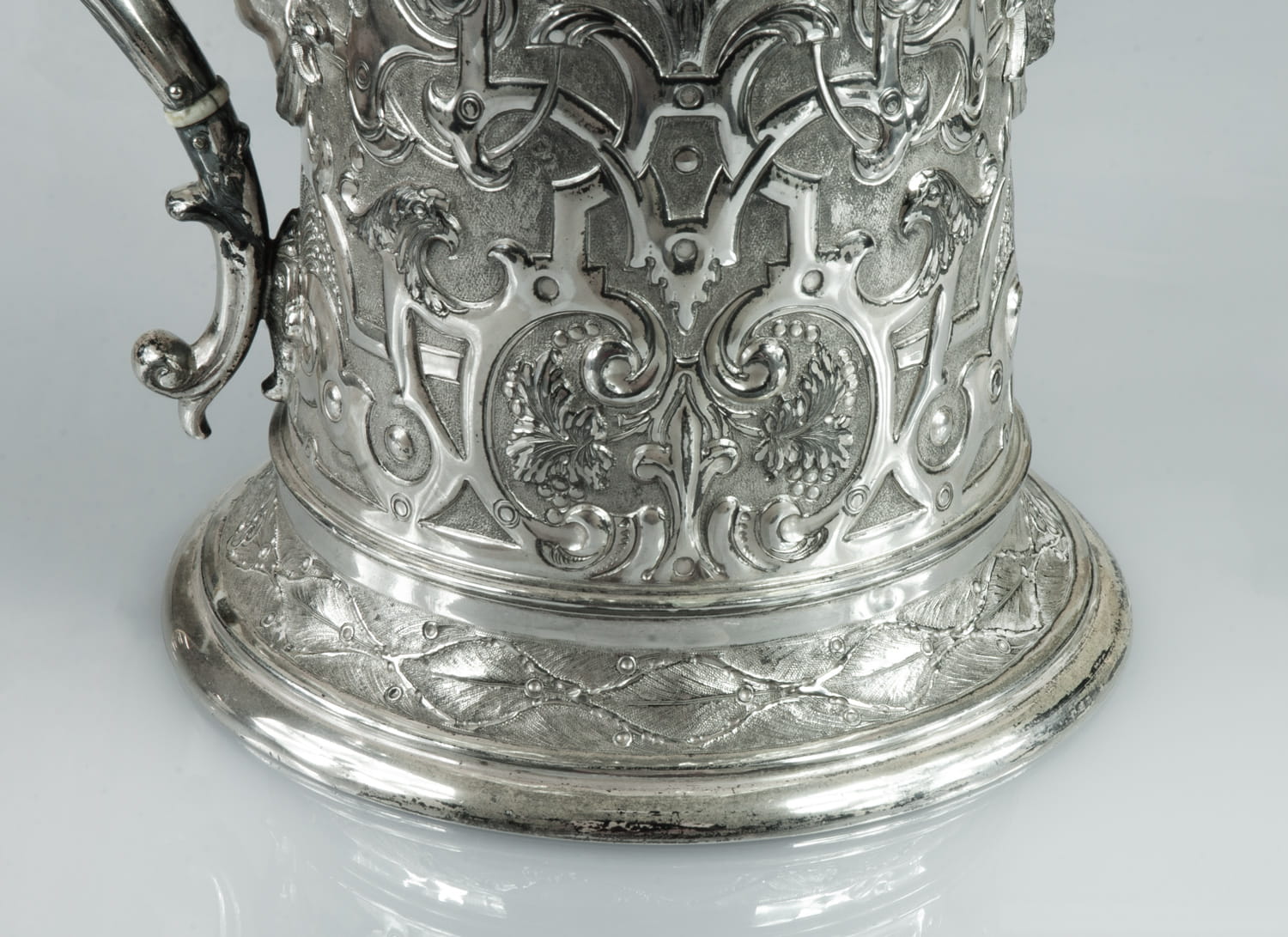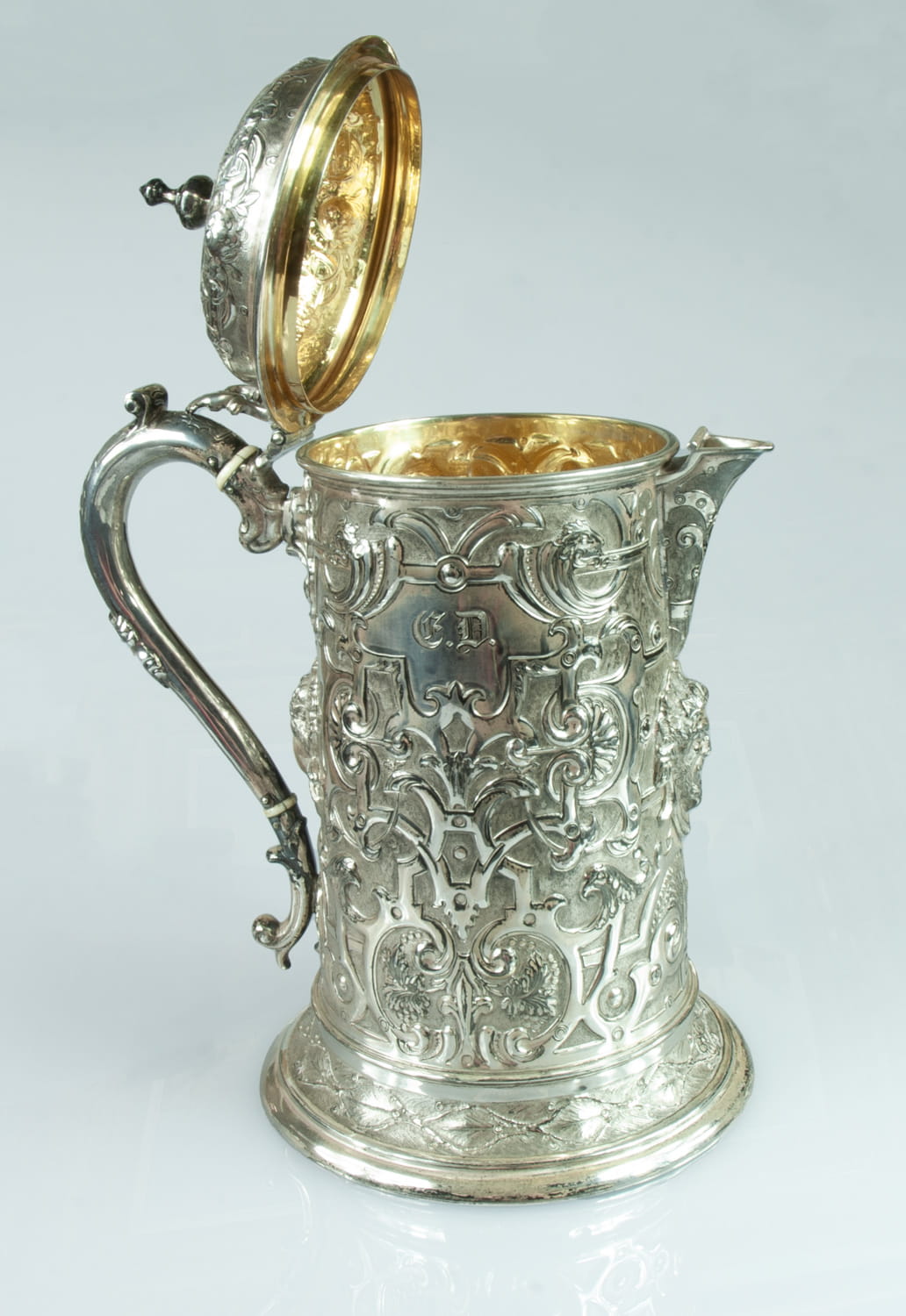 Richly decorated with repoussed and engraved ornaments; silver hallmarks 925, gilded, signed.