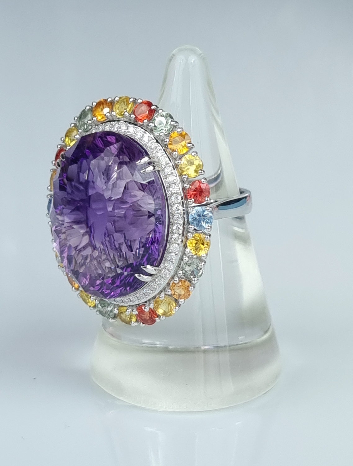Gold 585, amethyst, 24 sapphires, 52 diamonds.