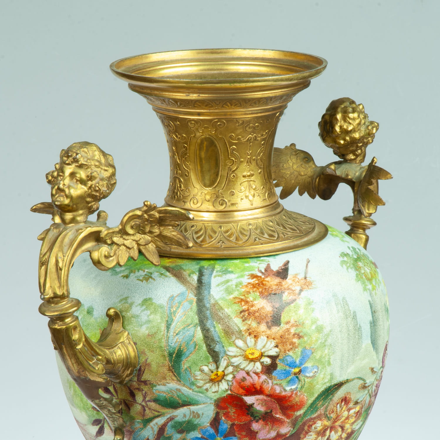 A hand-painted ikebana vase in a decorative binding made of gilded brass.