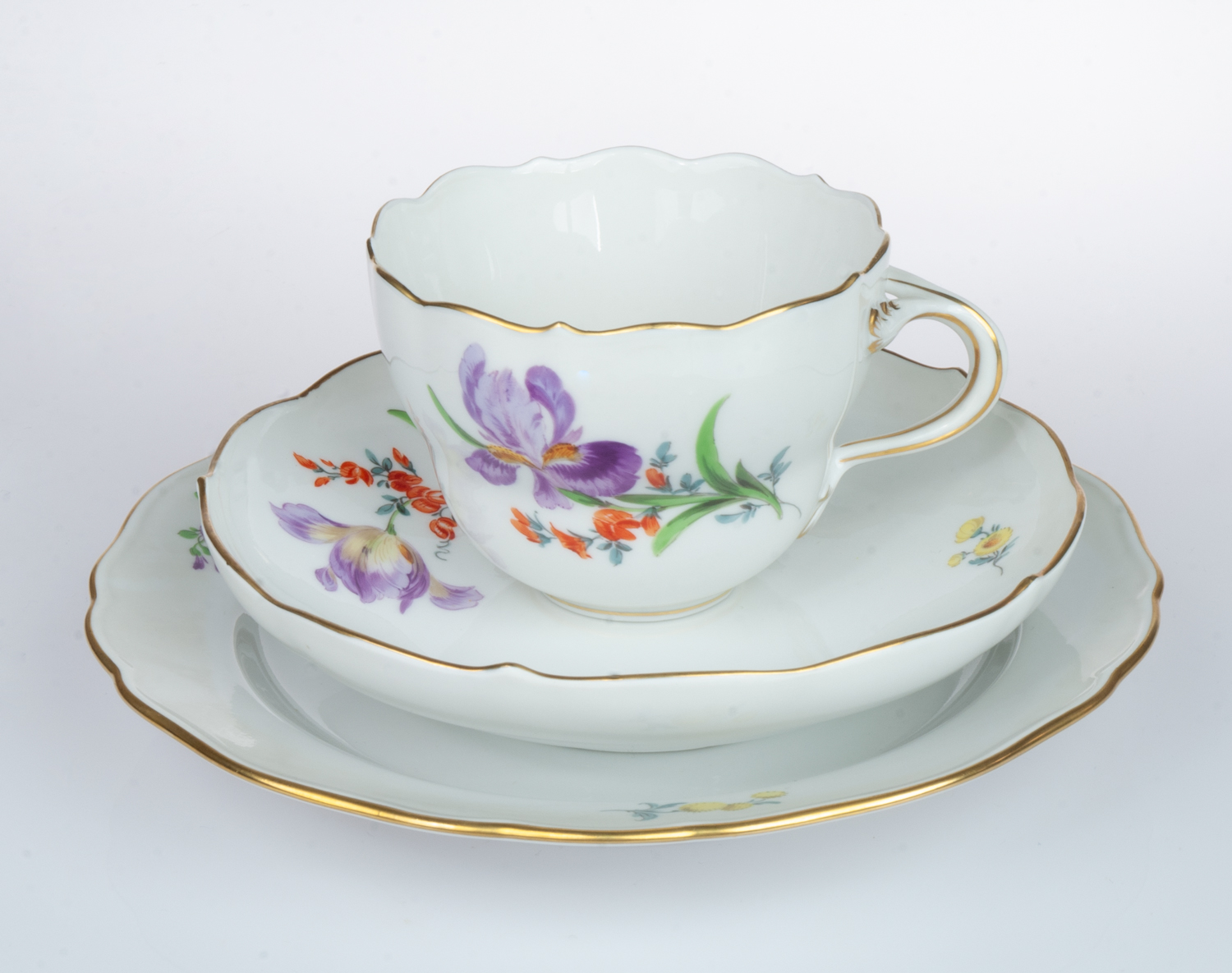 The breakfast set consists of a cup, saucer and plate. Set made of hand painted porcelain, gilded, signed.