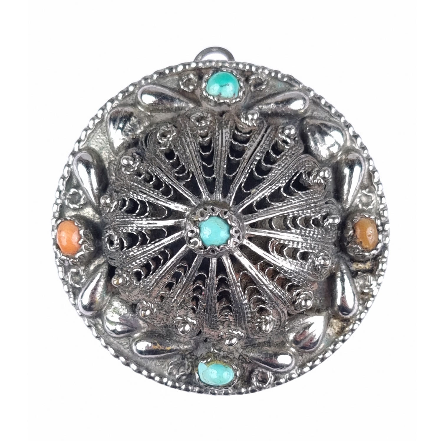 Brooch or pendant, silver filigree, turquoises.