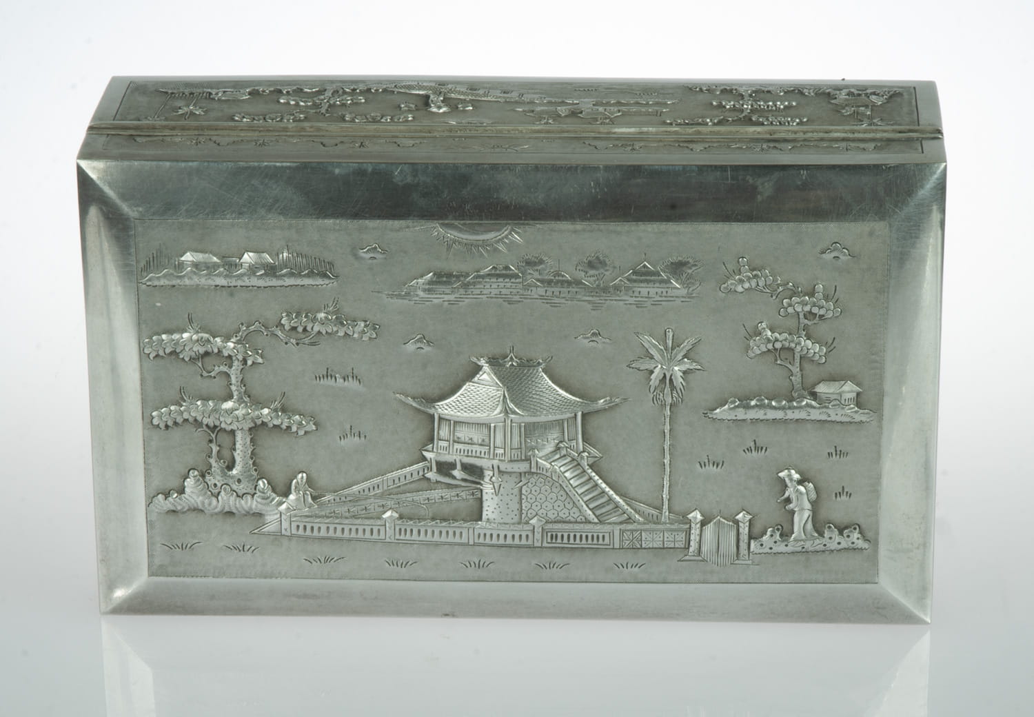 Decorative silver box (800) with wooden inside.