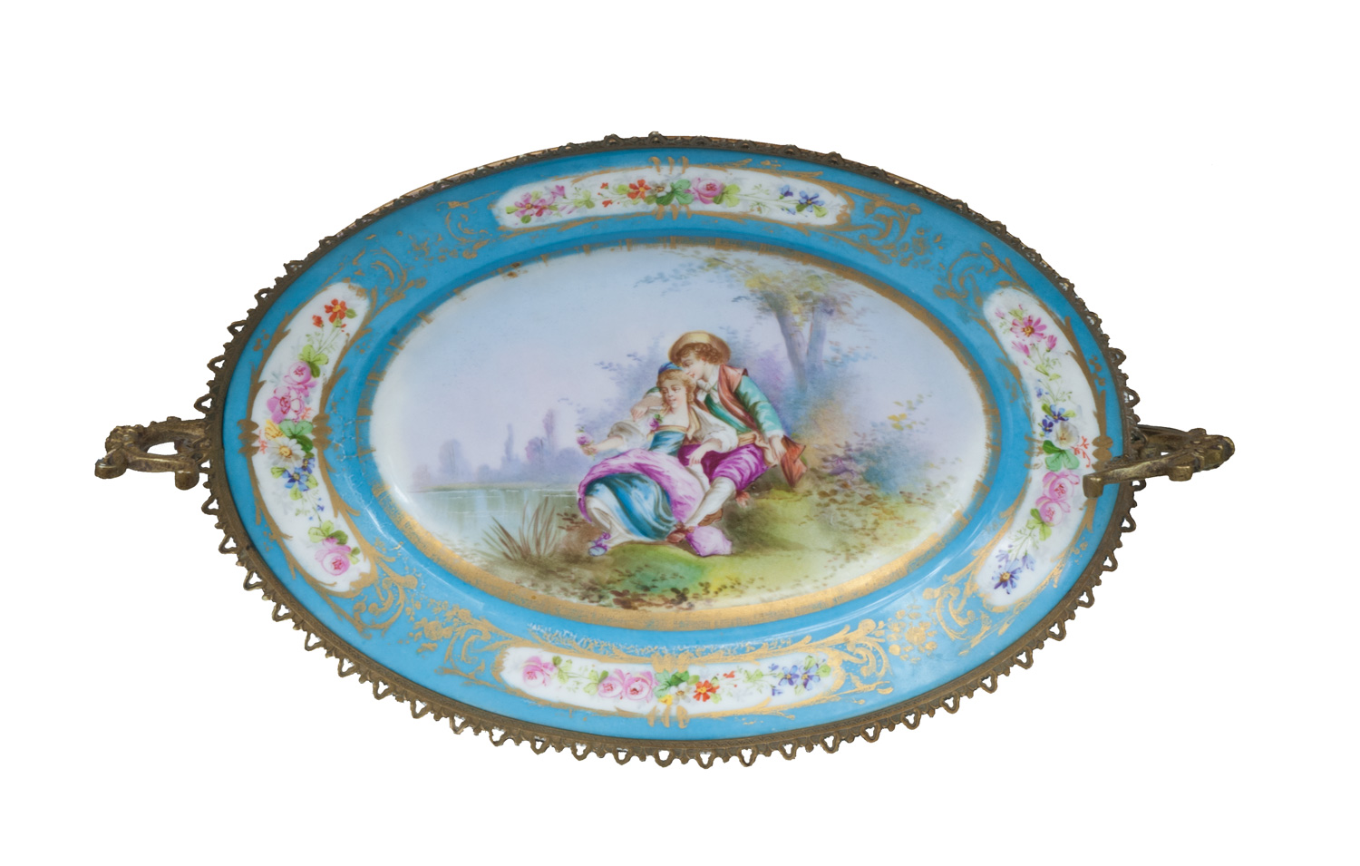 A Beautiful Rare 19th Century fine french gilt bronze and blue porcelain center dish. The bronze double handled and footed centerpiece features a signed hand painted porcelain bowl. The scene depicts a young man with a young woman at the lake and is surrounded by floral designs.
