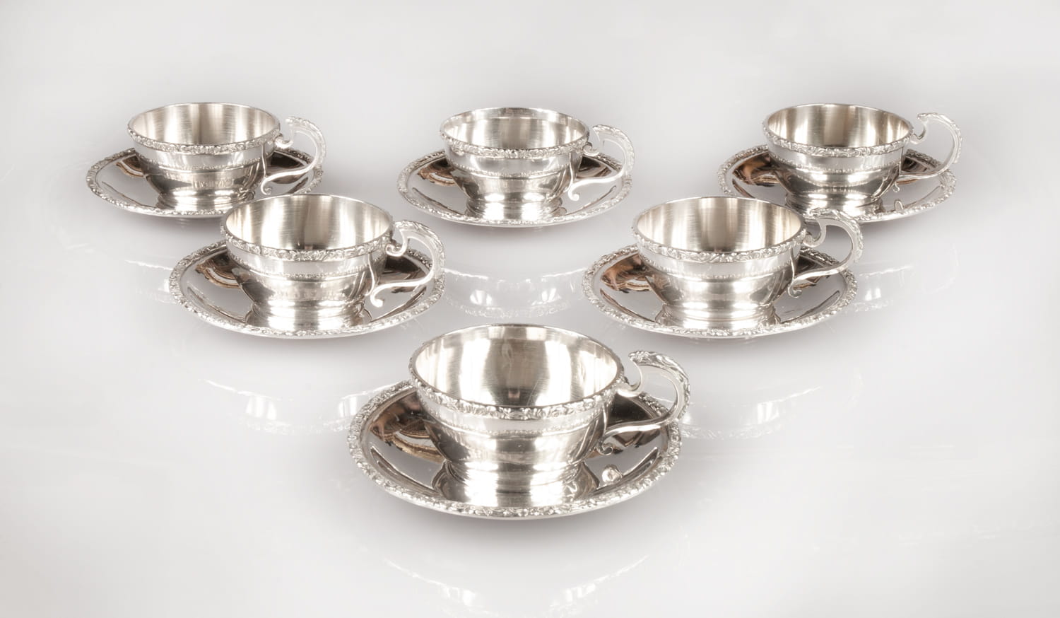 Coffee service consists of six cups with saucers, made of silver; signed.