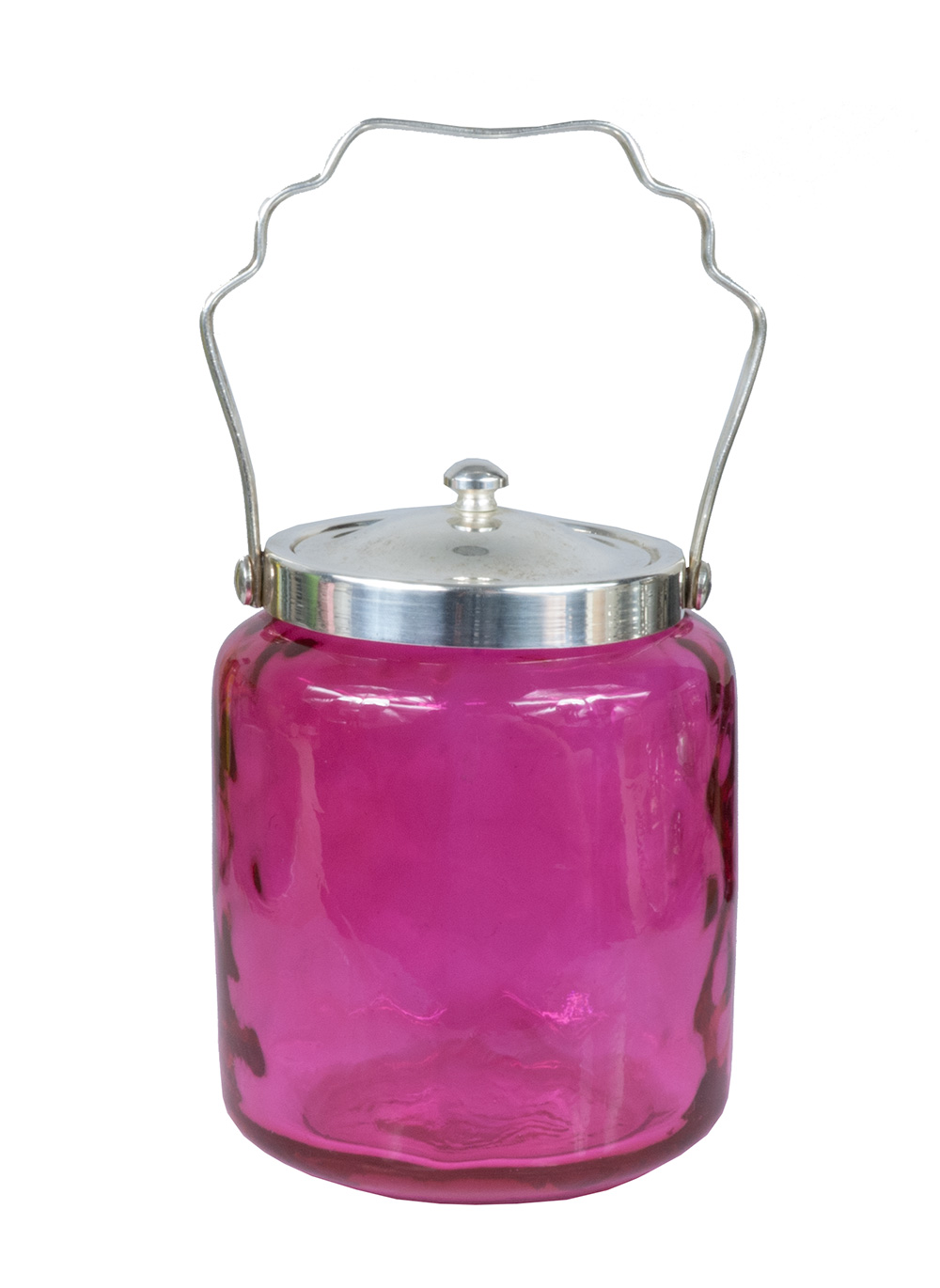 Glass cookie jar with moving handle and silver plate lid.