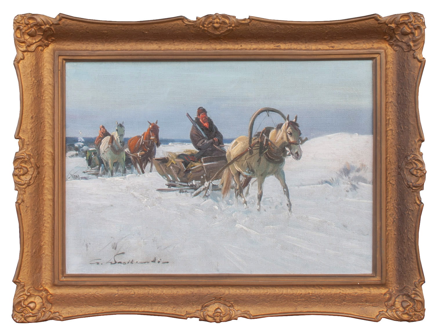 Czesław Wasilewski (1875-1947) probably using the pseudonym Zygmuntowicz, Baranowski, Wysocki, it is a Warsaw painter popular in the interwar period, the author of genre paintings inspired by Kossak, Brandt, Chełmoński, Wierusz-Kowalski and Fałat. He was self-taught, although in 1911 he signed up to the Warsaw School of Fine Arts, but his studies are not known. Perhaps he went there (1913-1917) to the studio of Wojciech Kossak, for whom he later prepared the underpainting for paintings in the early twenties. He participated in the exhibition in Lublin (1922), Warsaw (1925, 1926, 1927), Katowice (1926), Częstochowa (1927), Gdynia (1929), Kalisz (1931) and Poznań (1928, 1931). He mainly painted sleigh rides, hunting trips, patrols, moose and wild boars in the forests. He rarely painted flowers and still life.