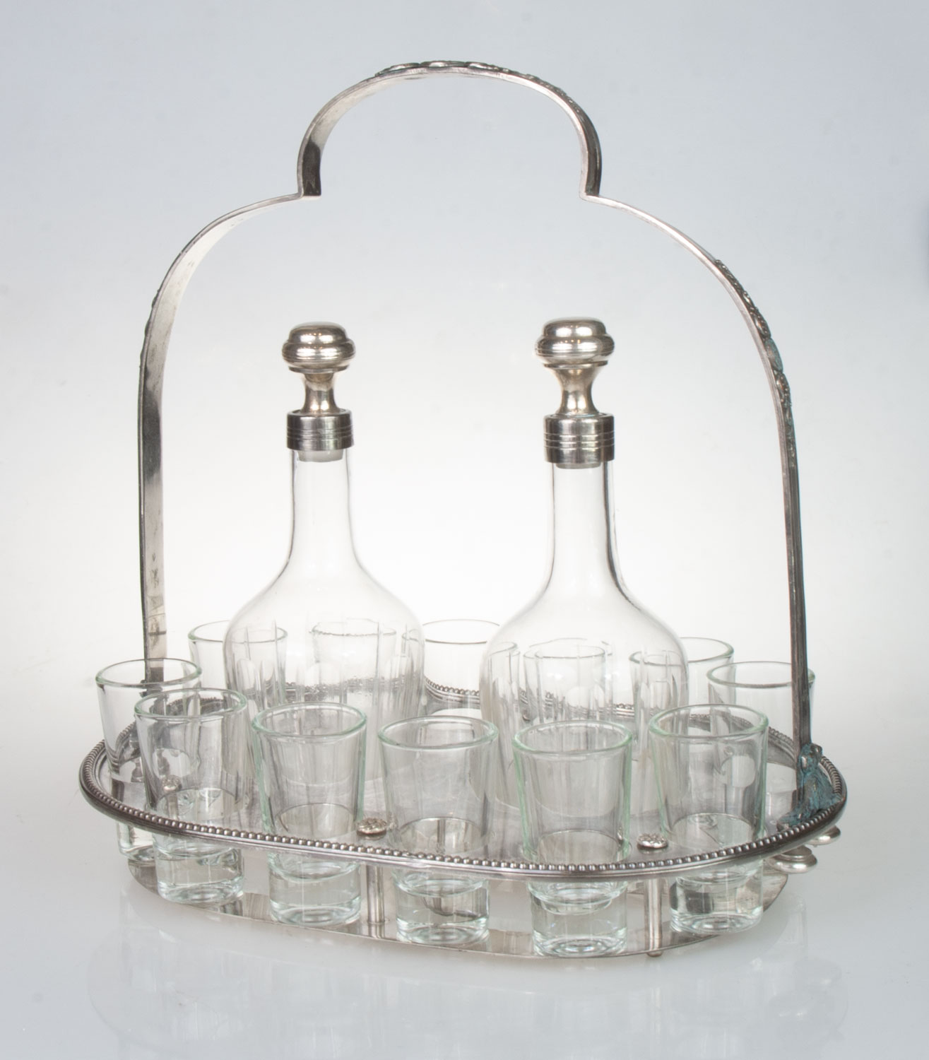 Two carafes, 12 glasses in silver plated holder, signed.