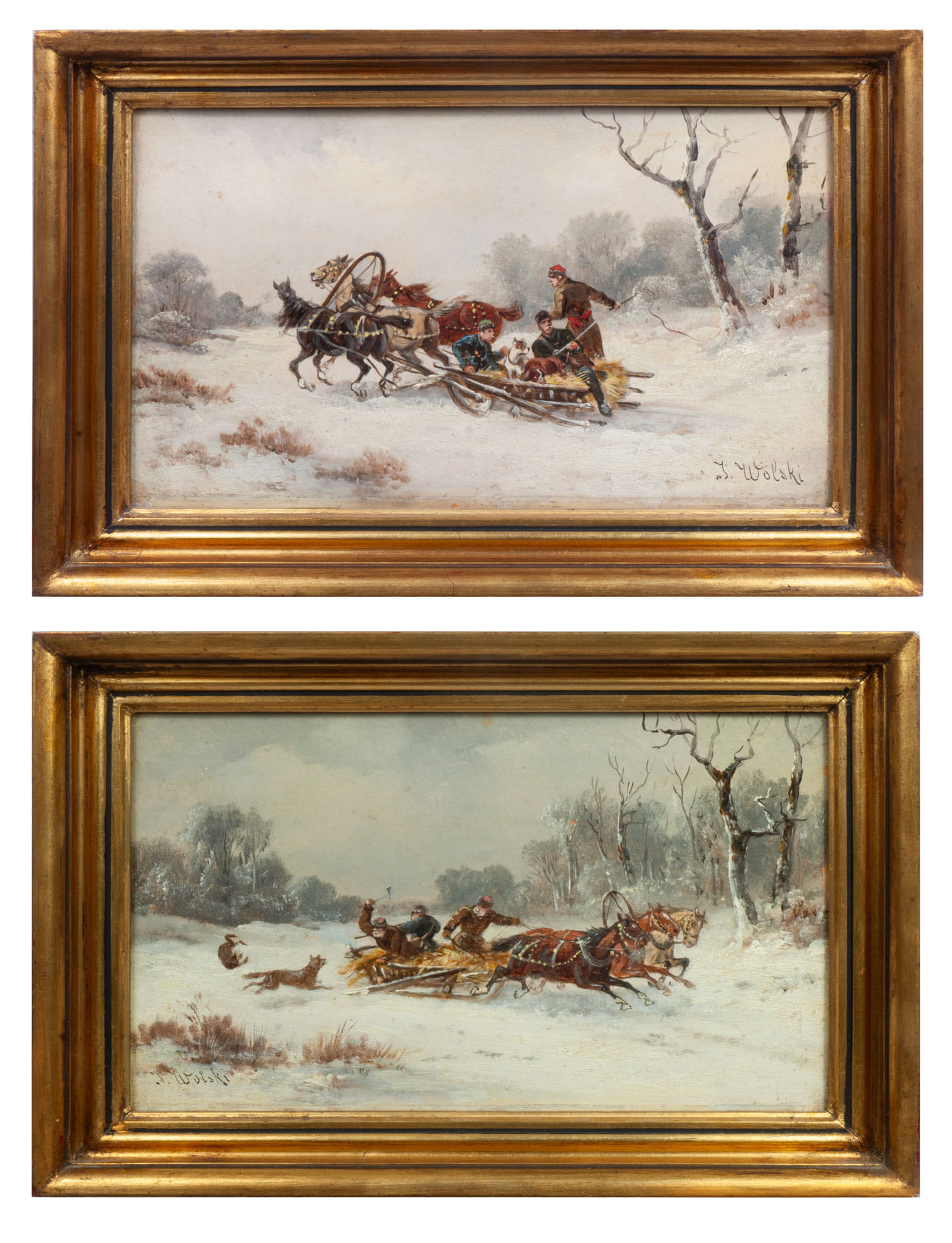Jan Wolski pair of paintings ”On the road to hunting” “Wolves attack”