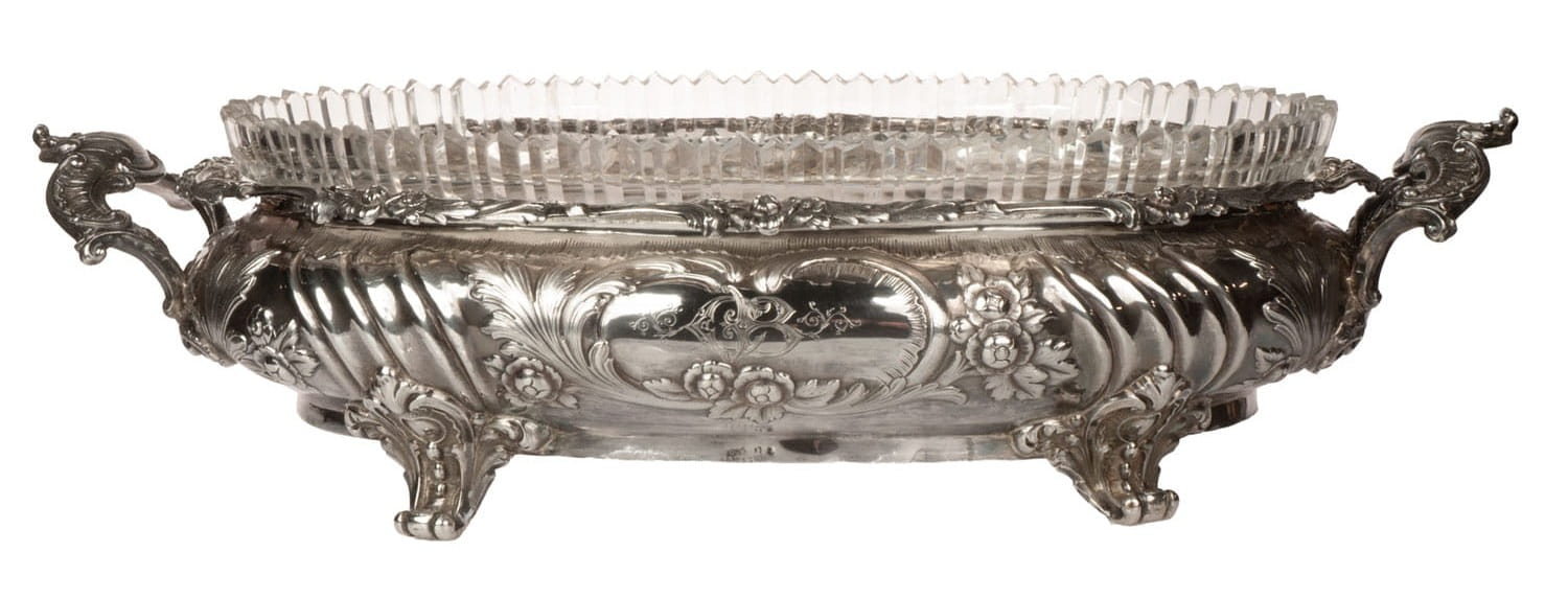 Jardiniere made of silver 800 with transparent glass insert.