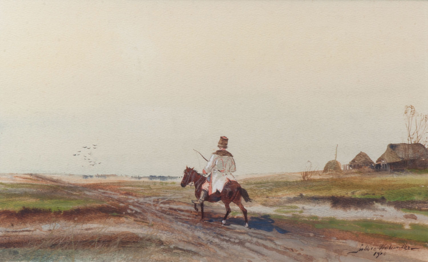 Juliusz Holzmüller (Bolechów 1876 - 1932 Lviv) - Polish painter. He attended the State Industrial School in Lviv for a course in decorative painting in the years 1897-1901, where he studied with R. Bratkowski, S. Rejchan, and T. Rybkowski. Then he studied at the Krakow Academy of Fine Arts in the studios of F. Cynka, J. Mehoffer and T. Axentowicz (1898-1906). In the years 1903-1904 he studied in Munich. After graduation, he settled permanently in Lviv. Most often he painted in watercolor technique, he also used sepia and ink. Holzmüller's favorite themes were landscapes, city views and genre scenes with horse motifs. Among his more well-known works include a series of paintings for the hunting pavilion of Prince Otto Habsburg in Rafajłowa, cycles with images of horses from great studs and battle paintings. He became famous as a painter performing battle sketches with the participation of Japanese cavalry in action; one of the watercolors on this subject was placed in the officers' casino in Tokyo. He exhibited a lot in Lviv and in Krakow's TPSP and Warsaw's Zachęta. His works are in museums in Kraków, Łańcut and Lviv.