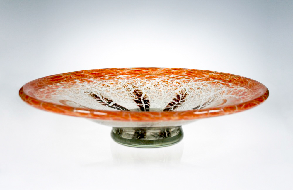 Compote in Art Deco manner, designed by Karl Wiedmann for WMF (Württembergische Metallwarenfabrik) factory; Ikora glass. Diameter: 36 cm.