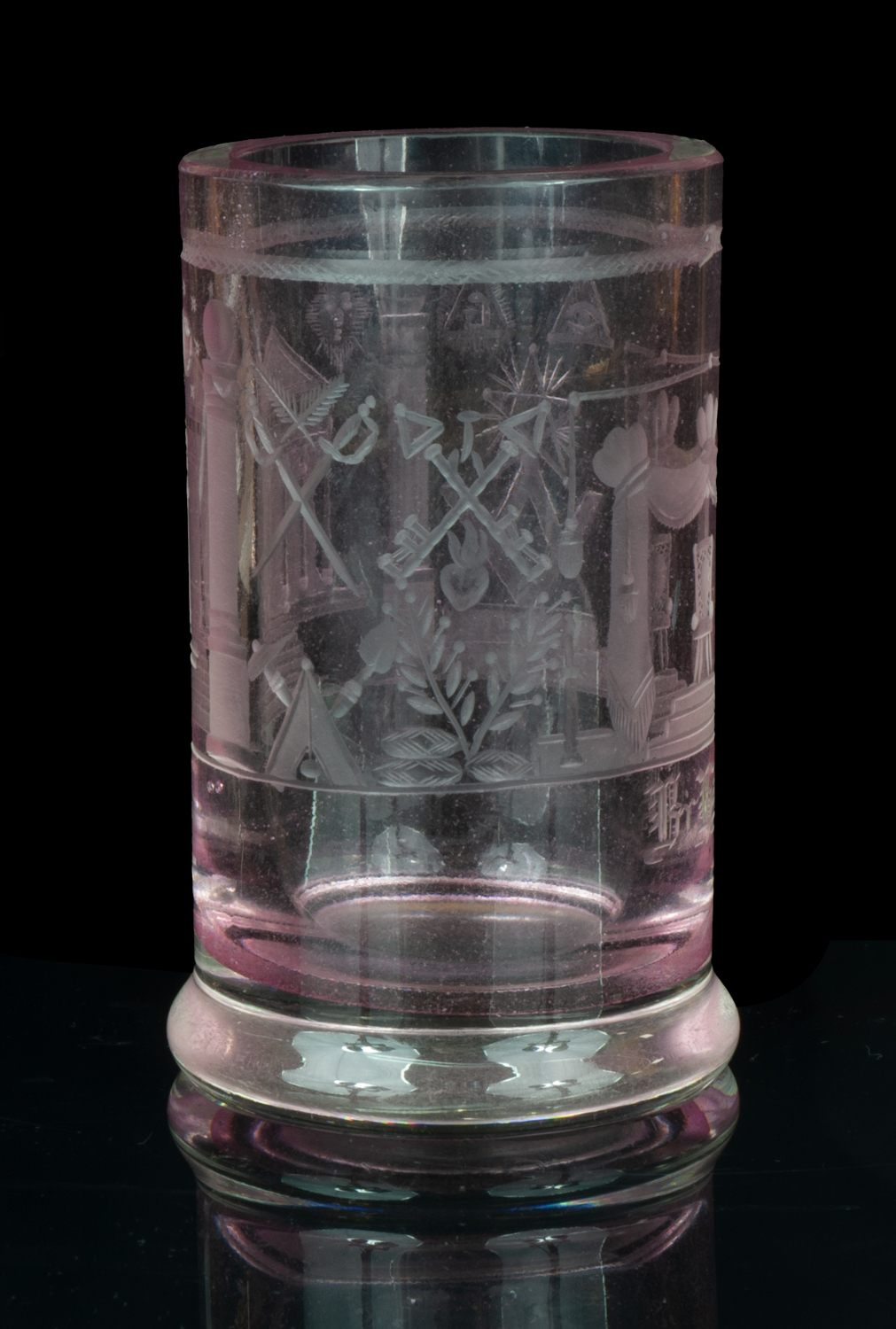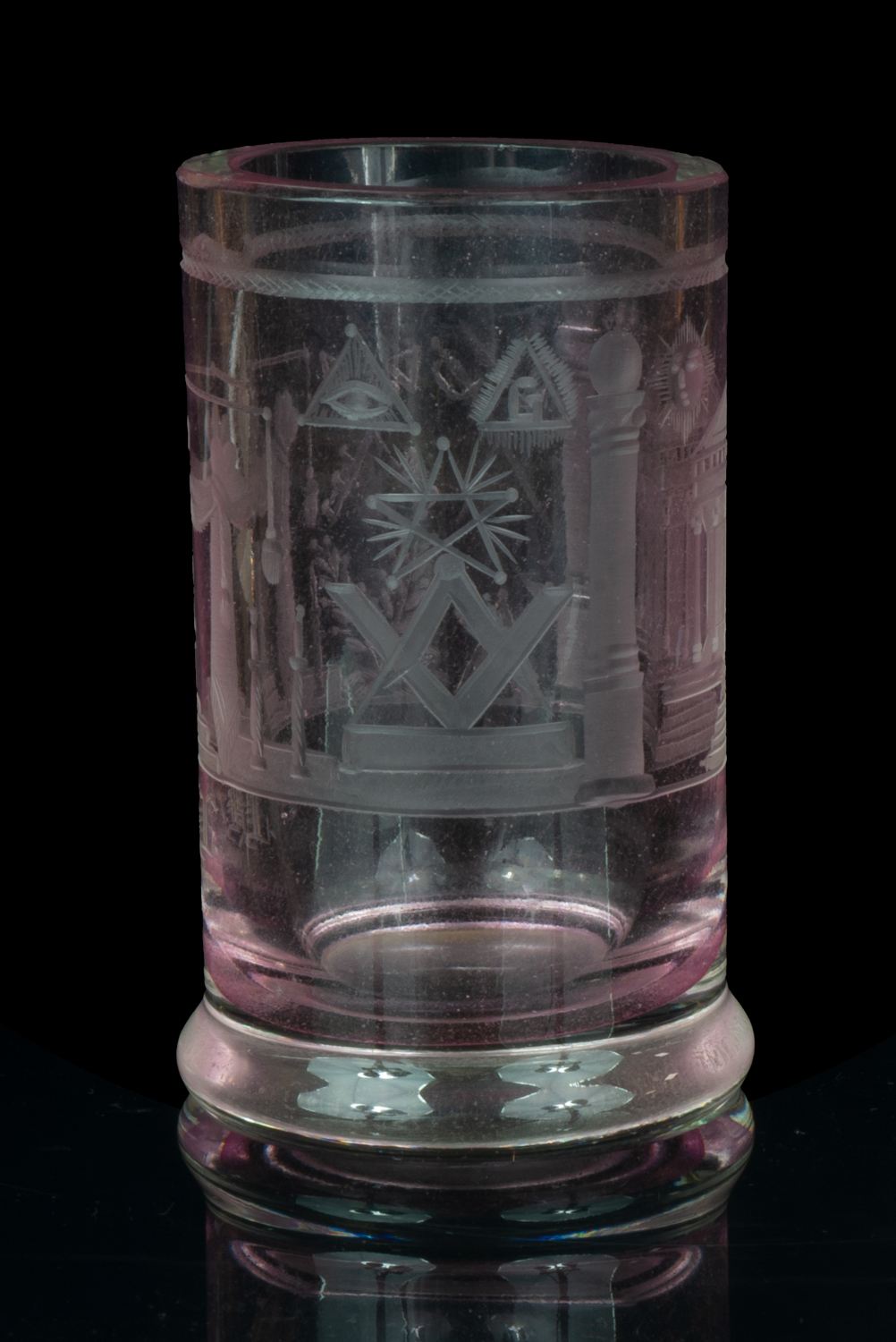 Delicate pink (manganese) glass, engraved. Rich Masonic symbolism is displayed on the surface: a compass and square, columns of the Temple of Solomon, the Eye of Providence, the sun and moon, stars, the Master's throne, and the temple with its colonnade. The glass is adorned with a decorative frieze at the top, in the form of a snake biting its own tail.