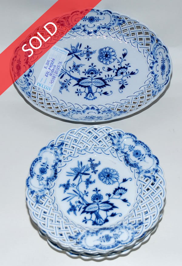 Meissen service consists of charger and six plates in so called onion pattern made of hand painted porcelain, signed.
