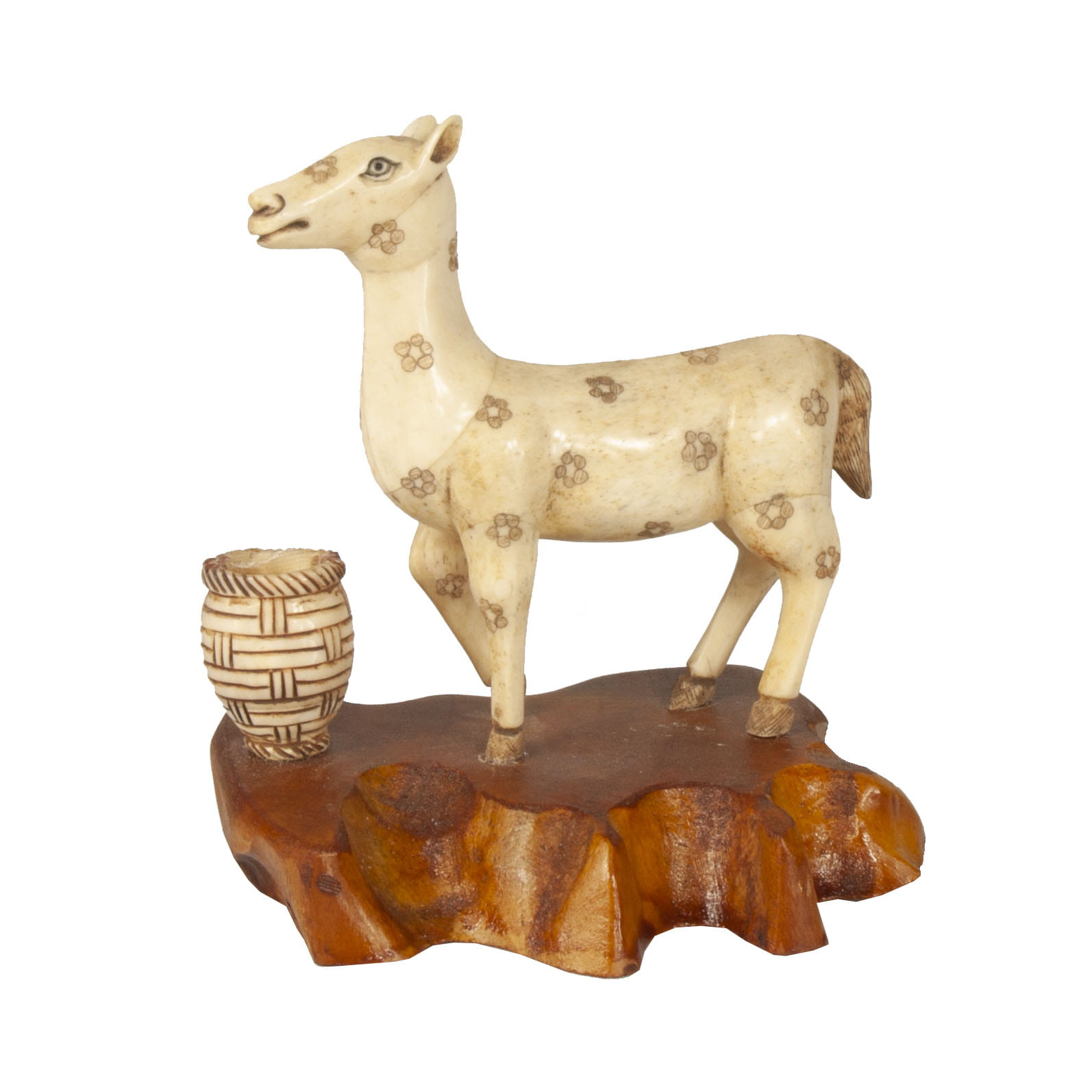 Hand carved okimono engraved, stained on the wooden base.