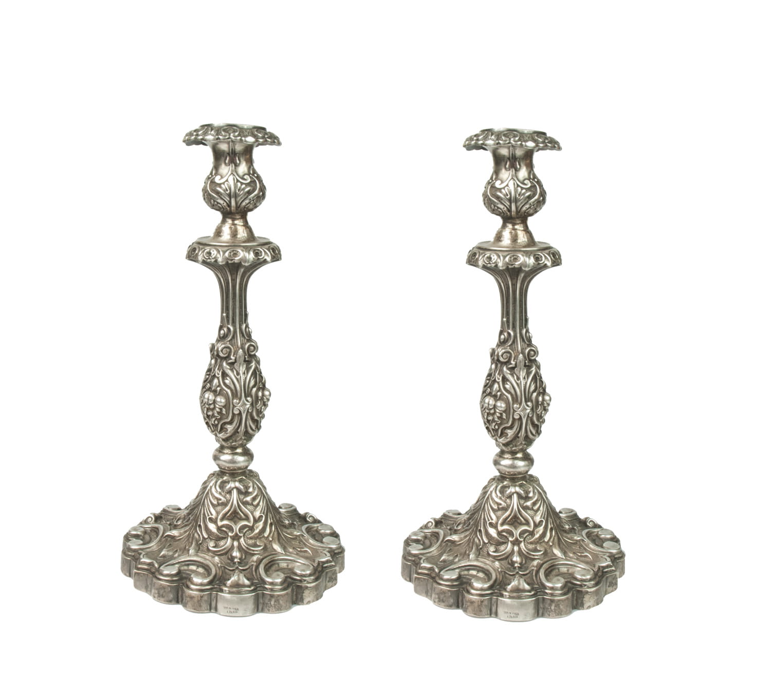 A pair of candlesticks richly decorated with acanthus leaves and floral ornament; silver signed "MCE MAYER A PARIS".