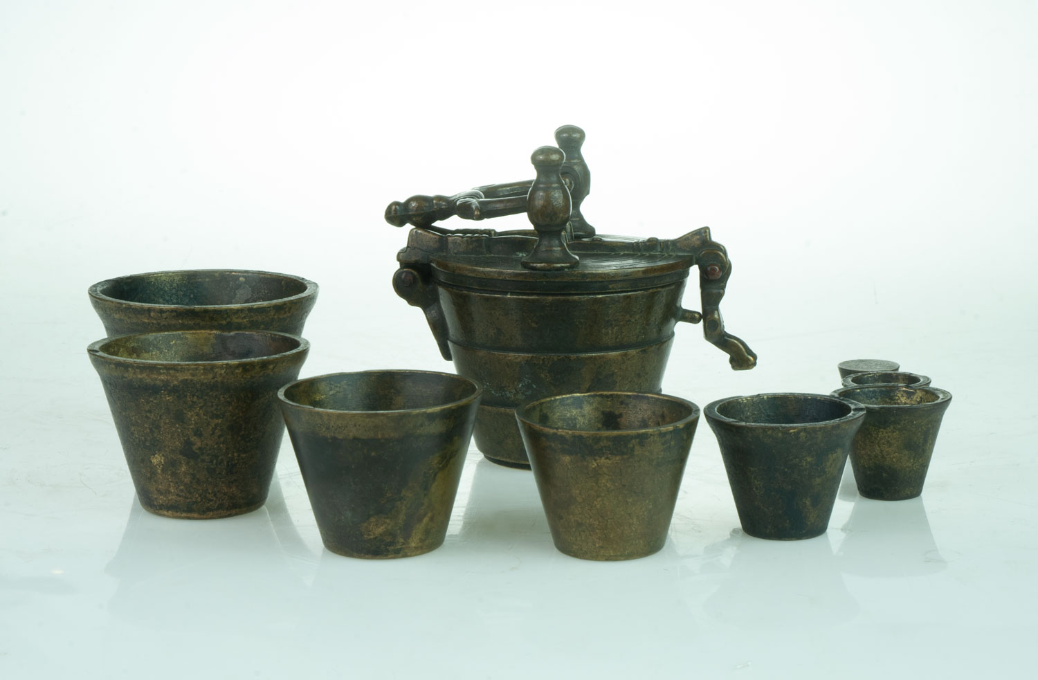 Pharmacist bronze nesting weight set, also known as pot weights or cup weights.