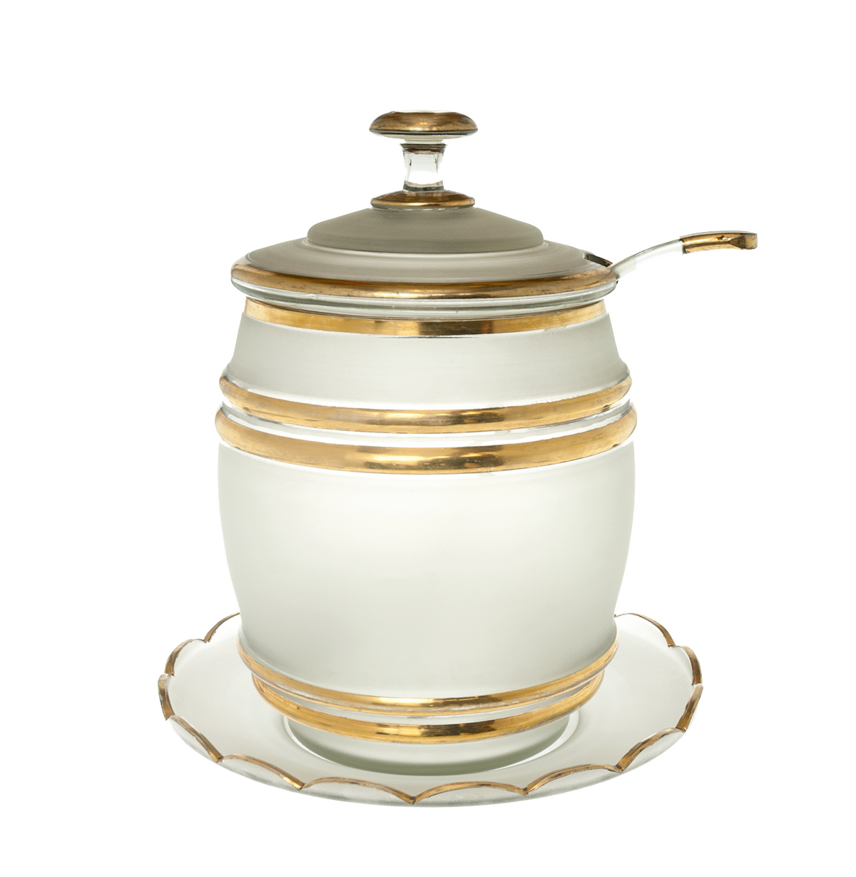 Punch bowl with cover and ladle, made of gilded, matt glass. Height: 33 cm.