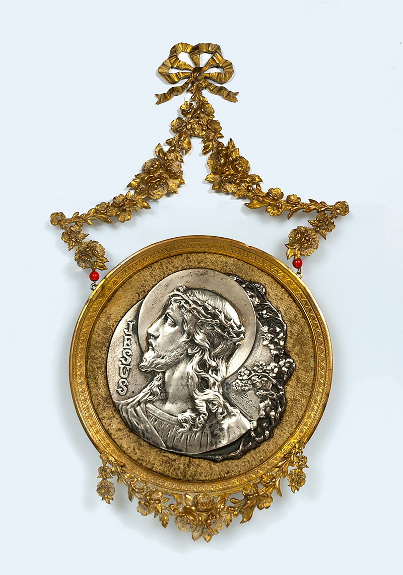 Crown of Thorns plaque, plated, signed, framed with gilded bronze with decorative two corals pendant, 30x17 cm.
