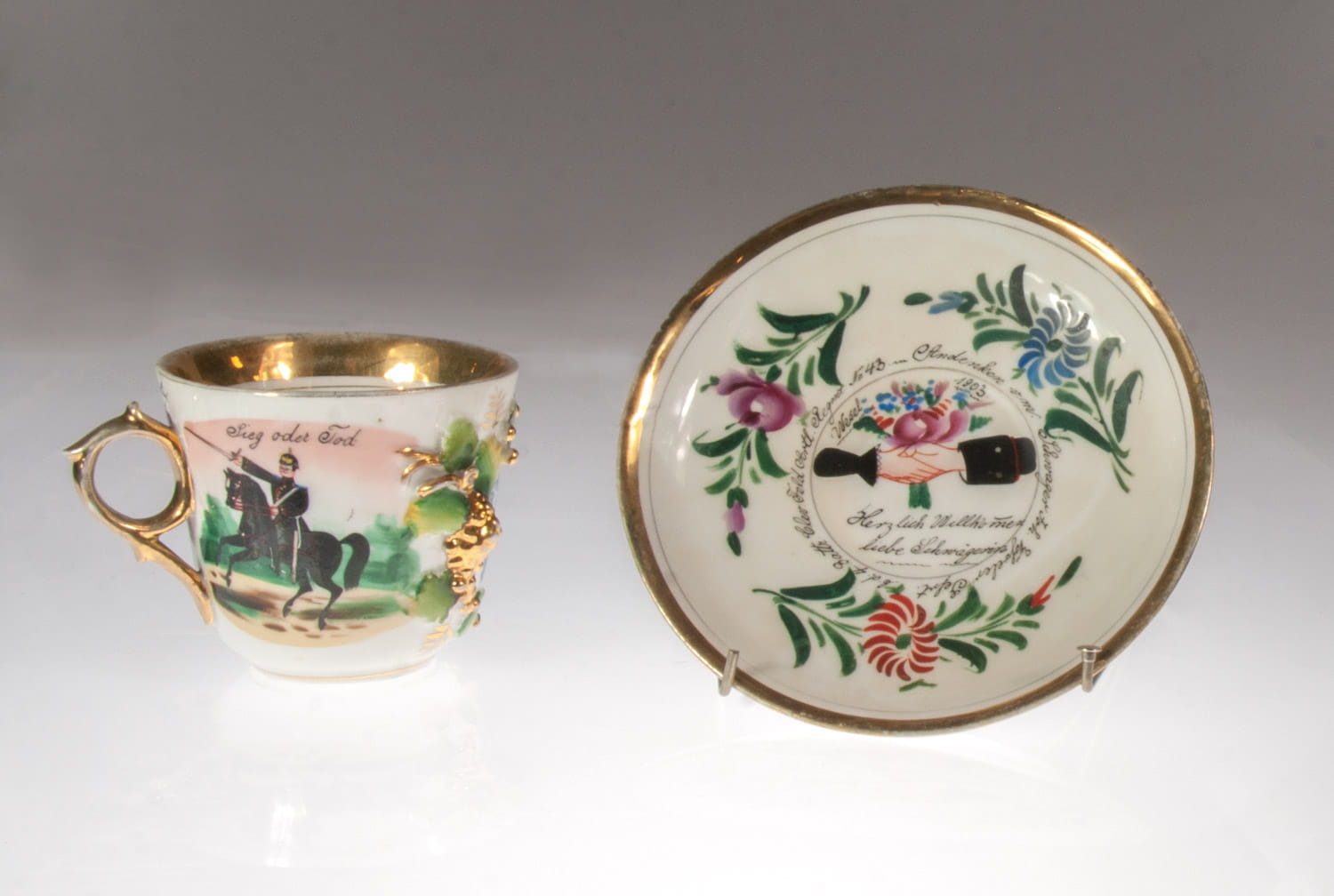 Mug: hand painted porcelain, tin lid, litophane. Cup and saucer: hand painted porcelain, partly gilded.