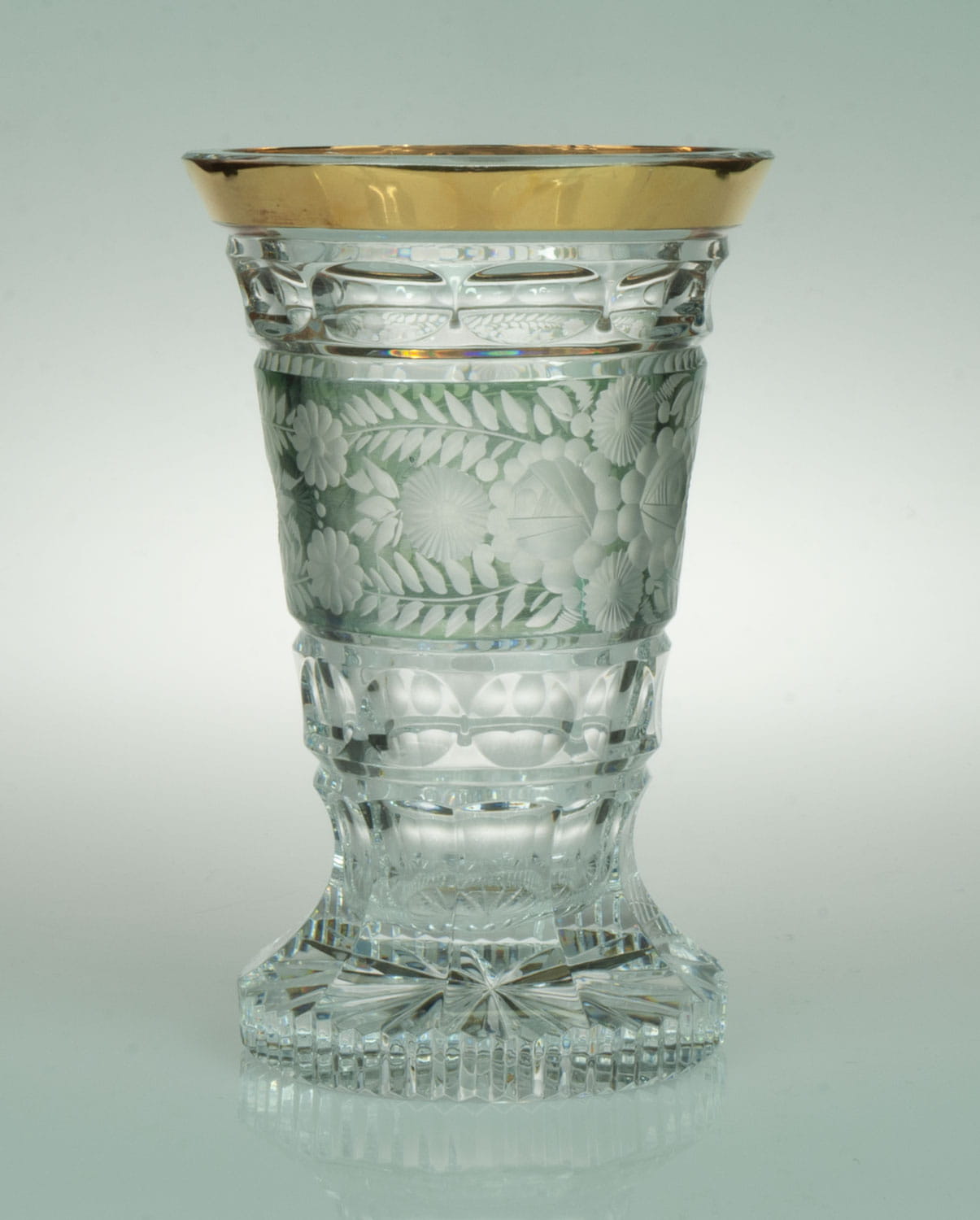 Layered, colored, cut glass, partly gilded.