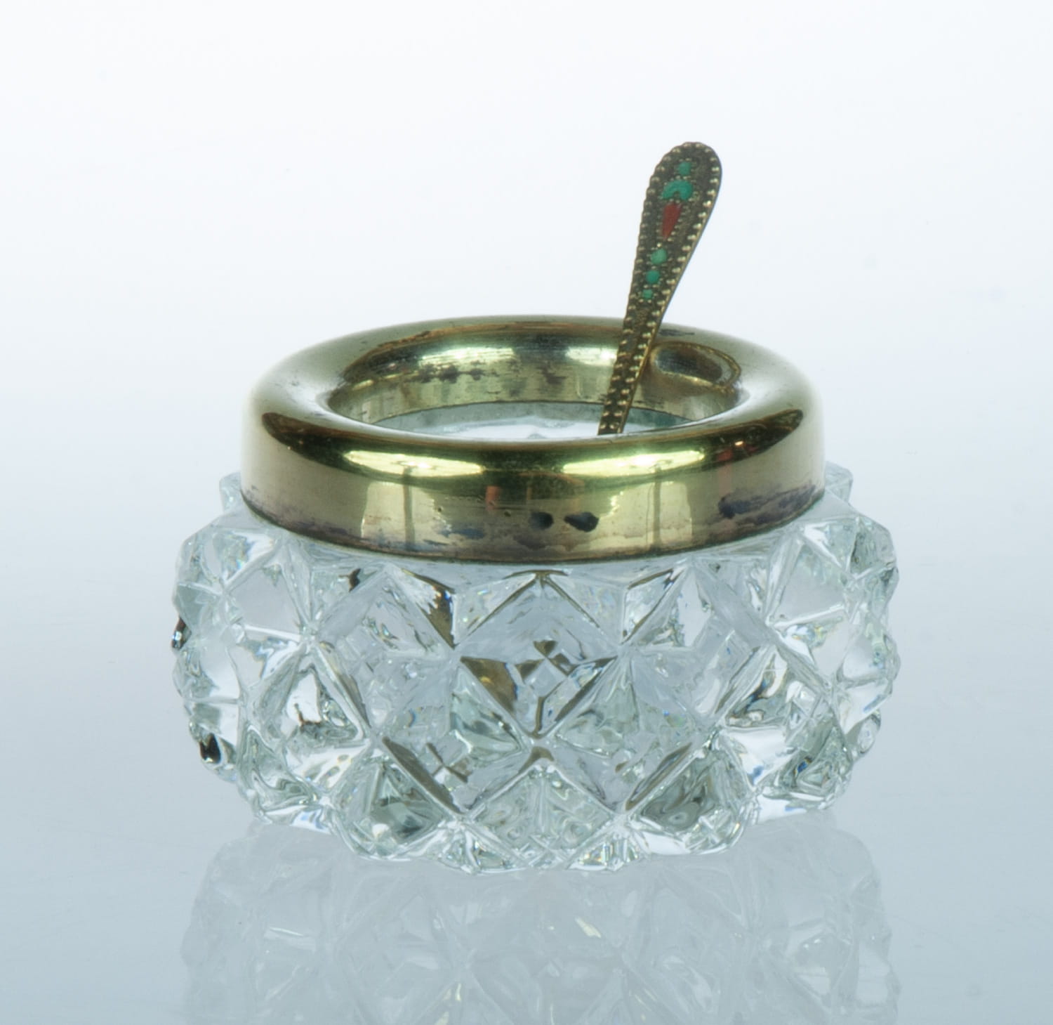 Crystal glass salt cellar with gilded silver 875 binding, set includes a small spoon decorated with cloisonné.