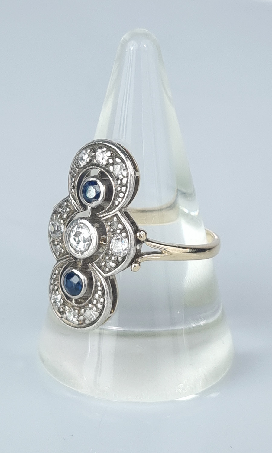 Gold 585, diamonds, sapphire.