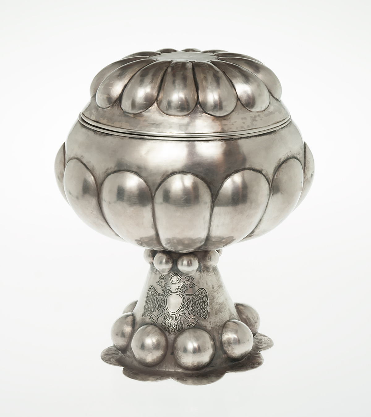 Silver box in the Neo-Baroque manner probably for hosts. Weight: 500 g. Height: 20 cm.