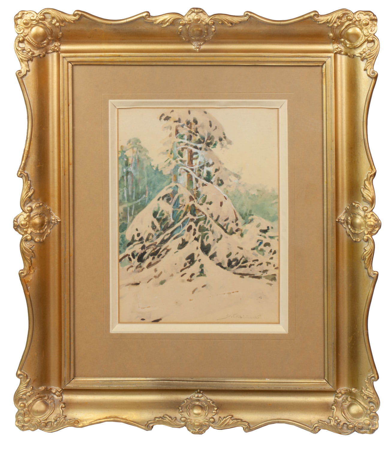 Stanisław Gibiński (1882-1971) - was a watercolor Polish painter; he painted landscapes, village genre scenes, fishermen or hunting, which he most often depicted in a snowy, winter landscape. He often participated in hunting and he knew the subject perfectly well. He also painted marshes, backwaters, autumn landscapes. His paintings clearly show inspiration from the art of Fałat and also by Wyczółkowski and painters of the Cracow school of landscape. The artist has participated many times in the exhibitions.