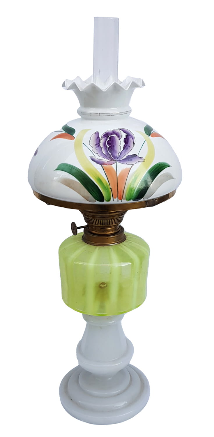 Kerosene lamp made of hand painted glass.