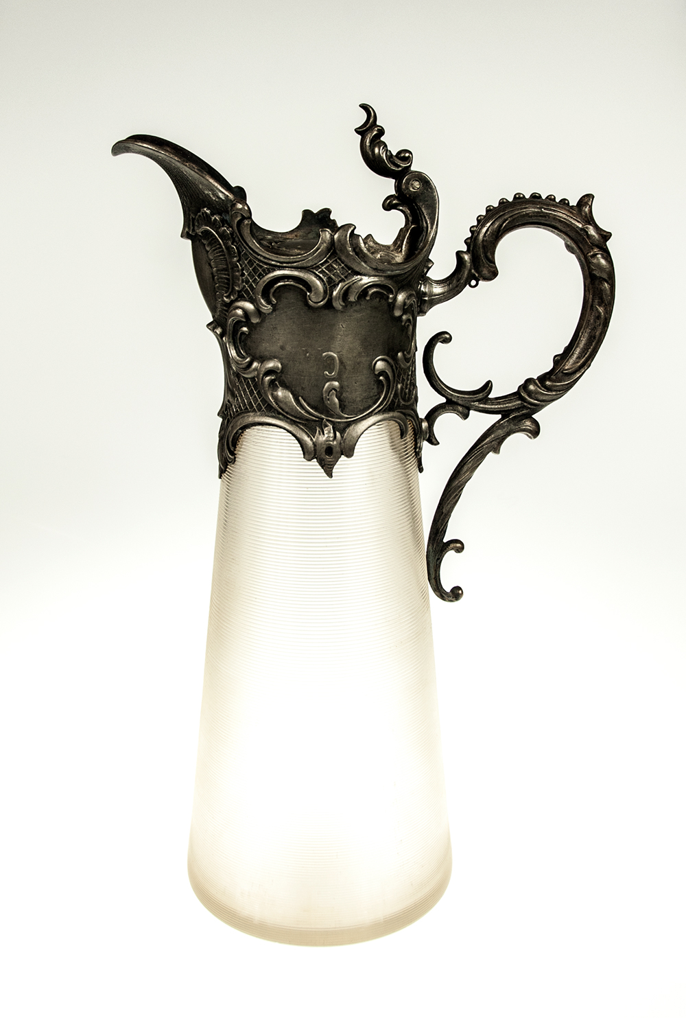 Wine carafe in the Rococo manner made of optically ribbed glass in the tin frame. Height: 29 cm.