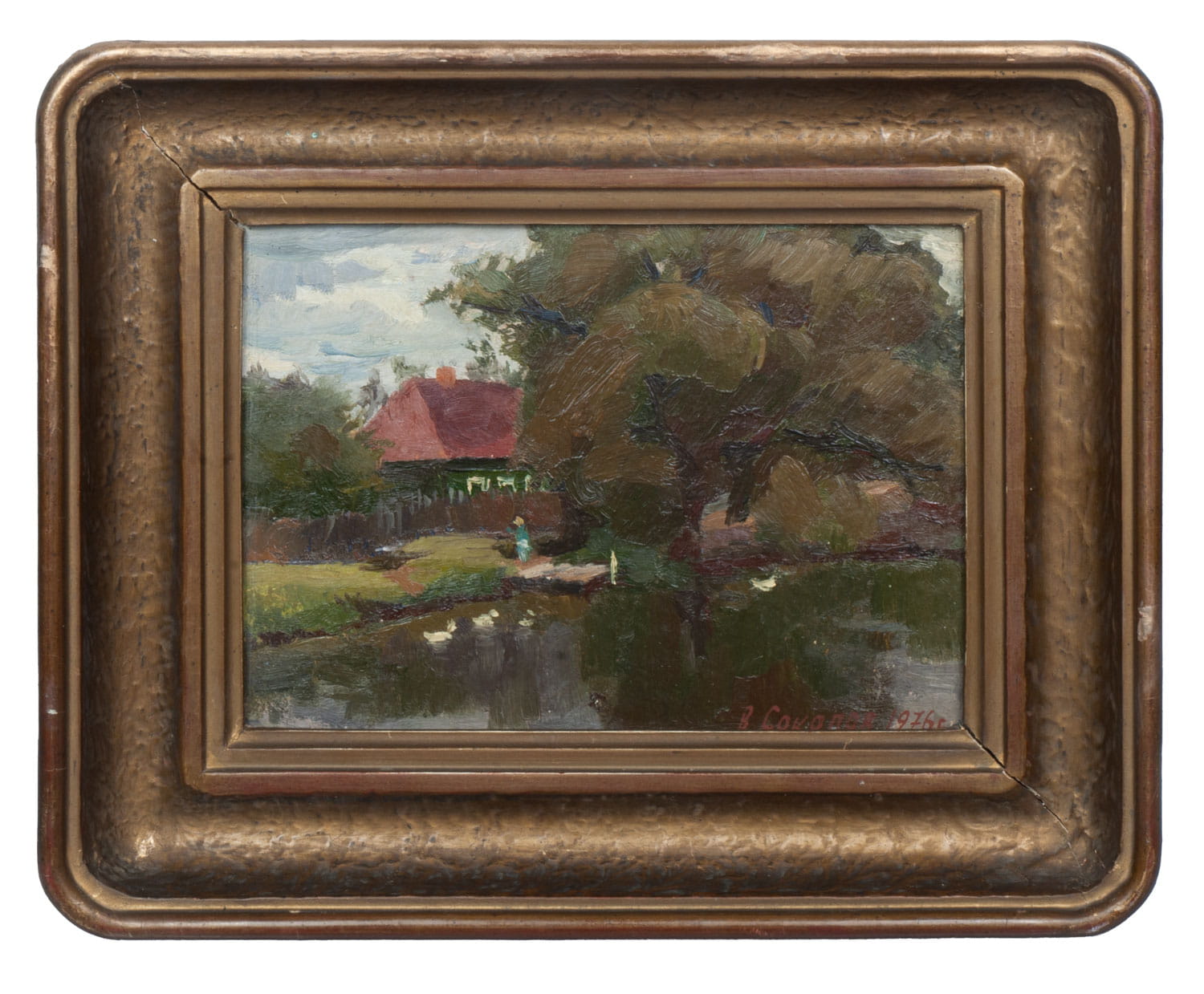 Oil on cardboard, signed in Cyrillic and dated lower right.
