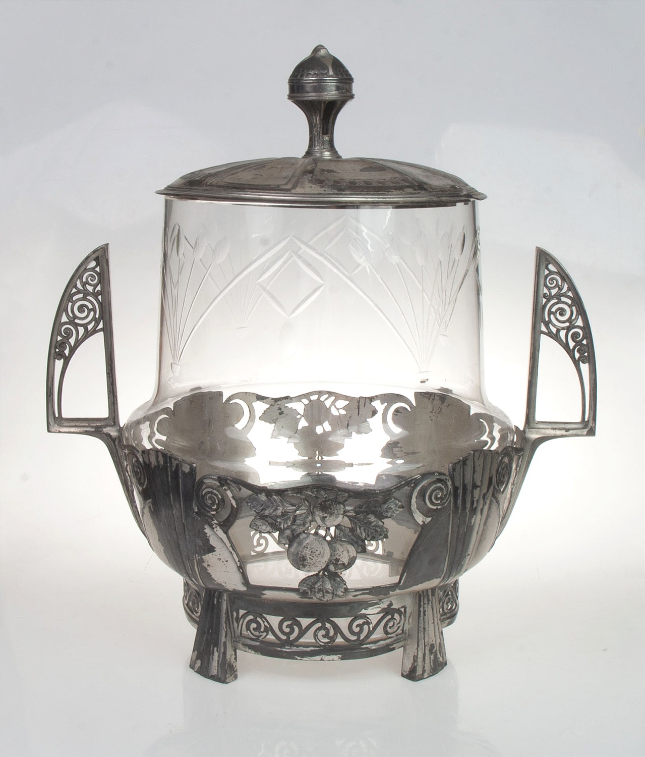 Secesyjna waza do ponczu, w formie cynowego, srebrzonego stojaka z dekoracyjnym motywem i wkładu z ciętego, szlifowanego szkła, całość zwieńczona pokrywą z okazałą sterczyną.