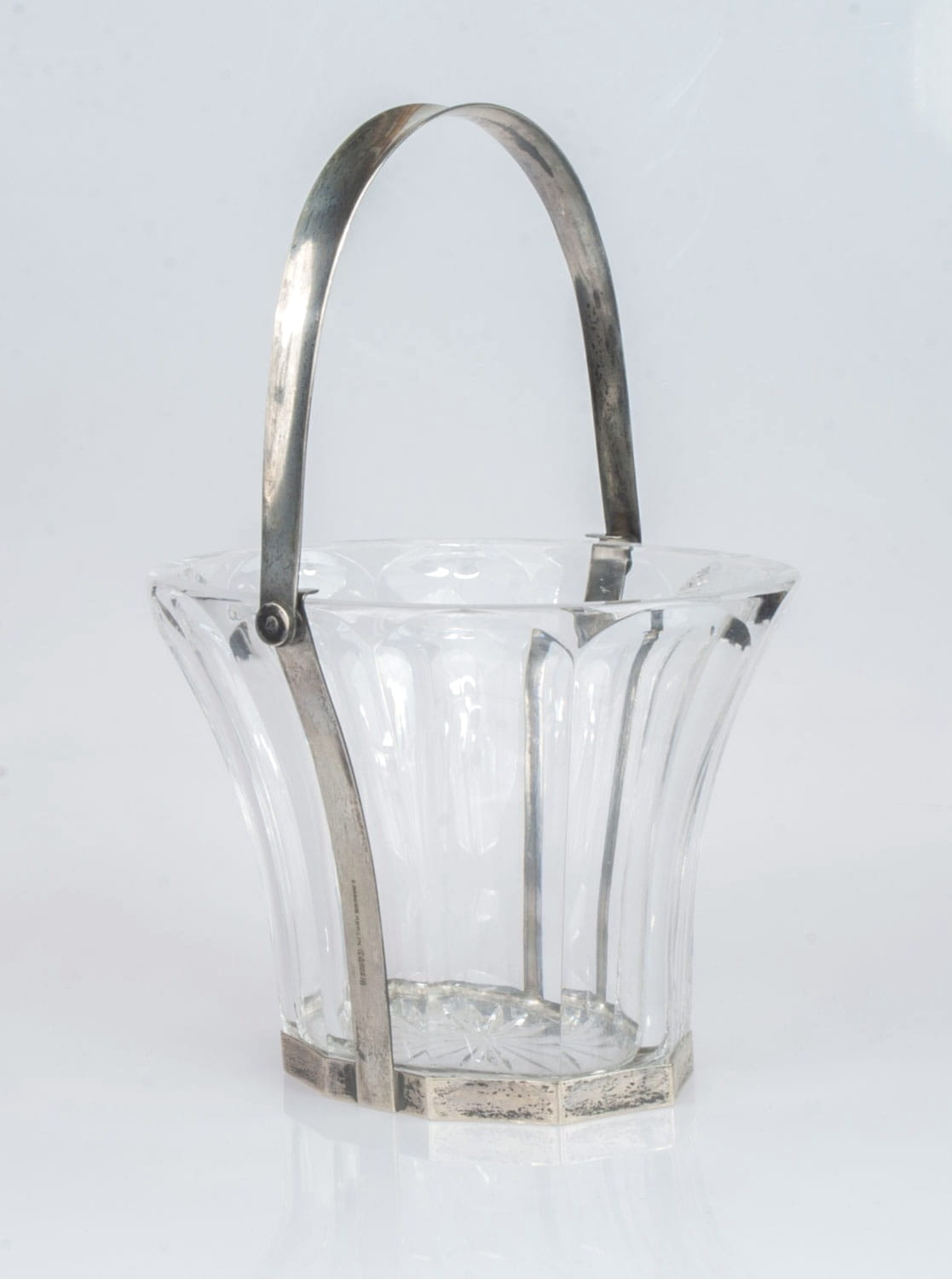 Szklana bomboniera w formie kosza w oprawie ze srebra z ruchomym pałąkiem. Srebro pr. 925, sygnowane “E.MARCUS BERLIN”.