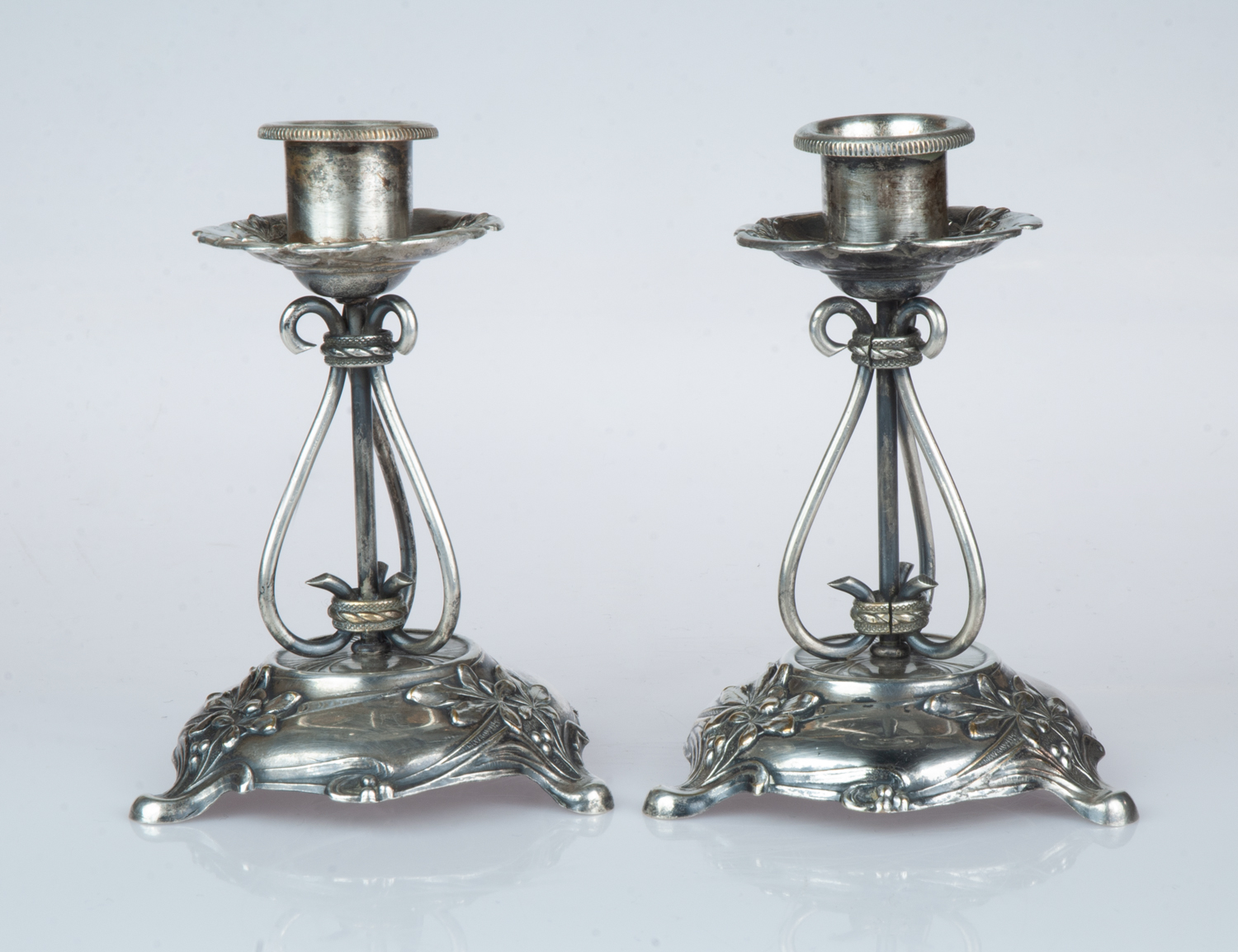 Platerowane lichtarze, bogato zdobione motywami roślinnymi.