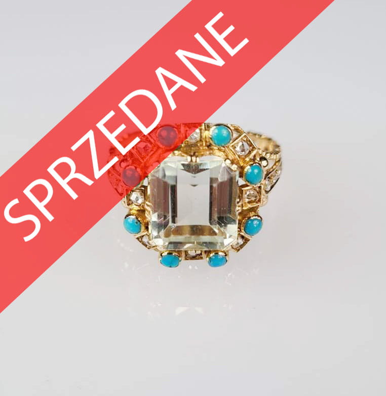 Złoto pr. 800, akwamaryn, turkusy, brylanty.