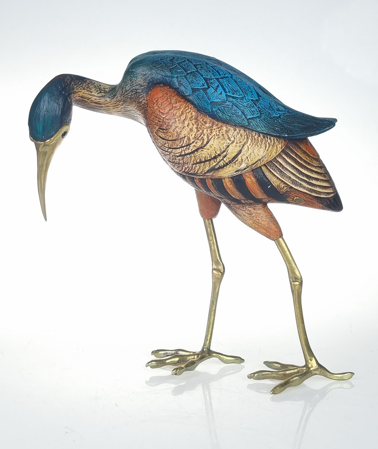 Rzeźba ręcznie malowana, odlana z żywicy, nogi i dziób z mosiądzu. Sygnowana.