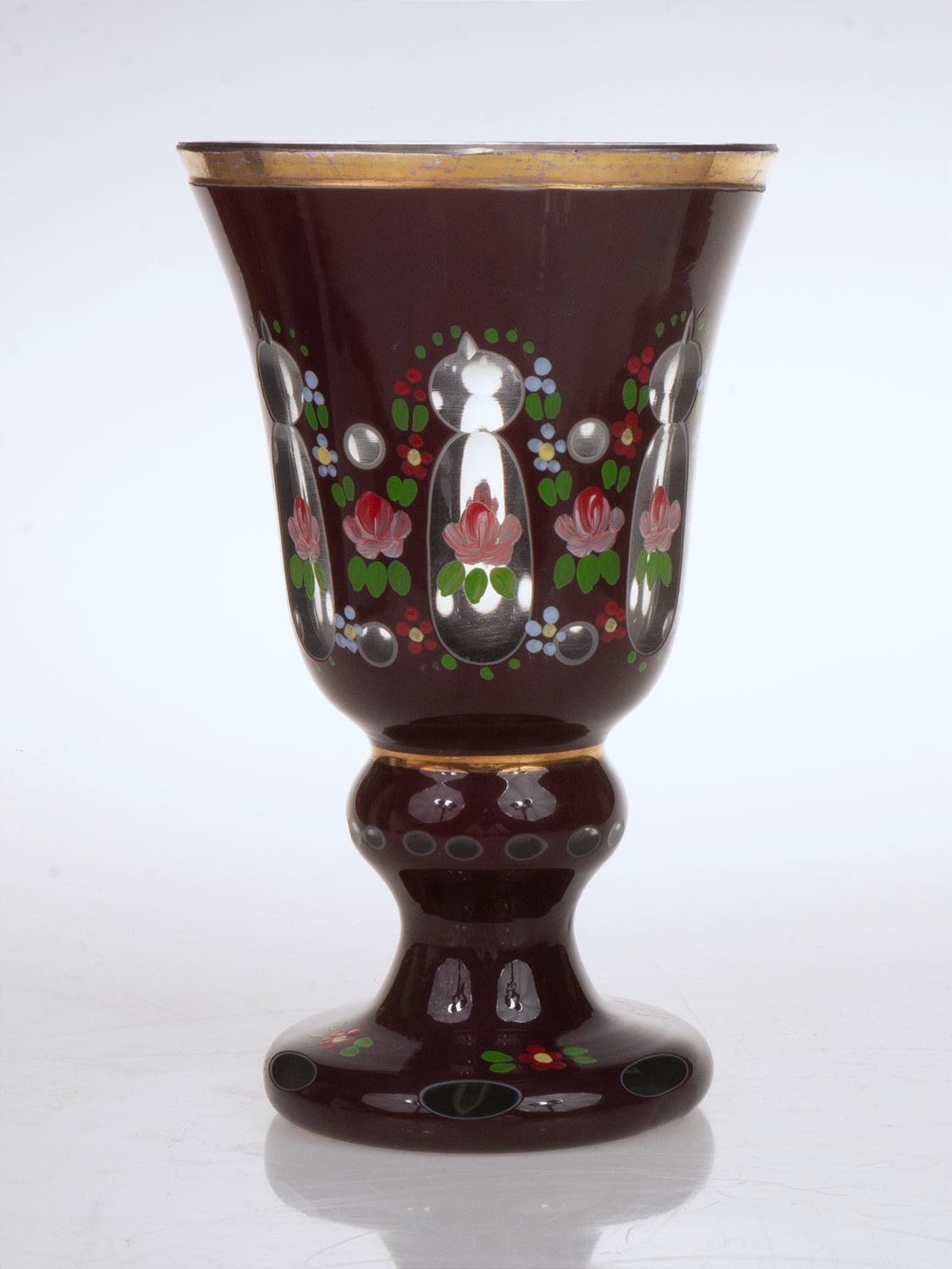 Szkło warstwowe, barwione w masie, szlifowane, ręcznie malowane, złocone.