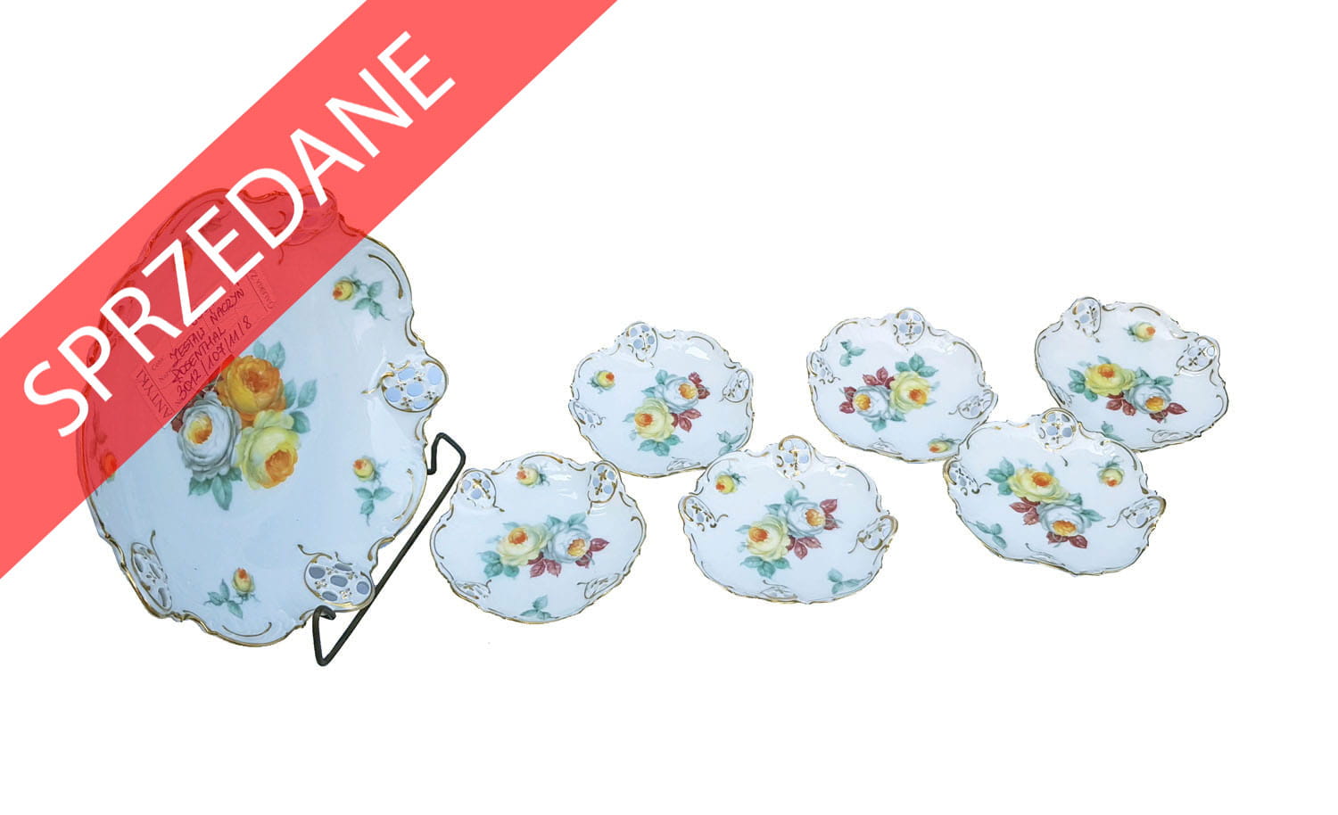 Komplet w skład którego wchodzi sześć talerzyków i paterka. Porcelana sygnowana, częściowo złocona, wzór dekoracji „Isabella”.